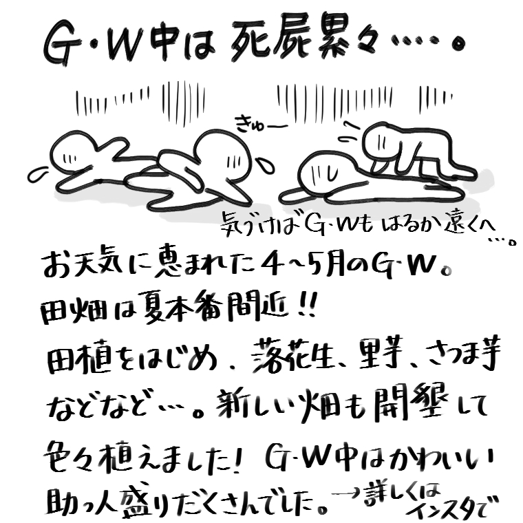 農業日記(GW) まほろば便り 2024.05.10 農業を始めて、ゴールデンウイークとは一番休めない時期だということを知りました(笑) それでも、かわいいお客様連れの訪問があったり(子供はみんなイチゴが大好き!)、沢山の差し入れをいただいたり…と、本当にありがたかったです! このGW中に植えたコシヒカリと、夏秋野菜の一部が皆さんの元に届きます!待っててね!